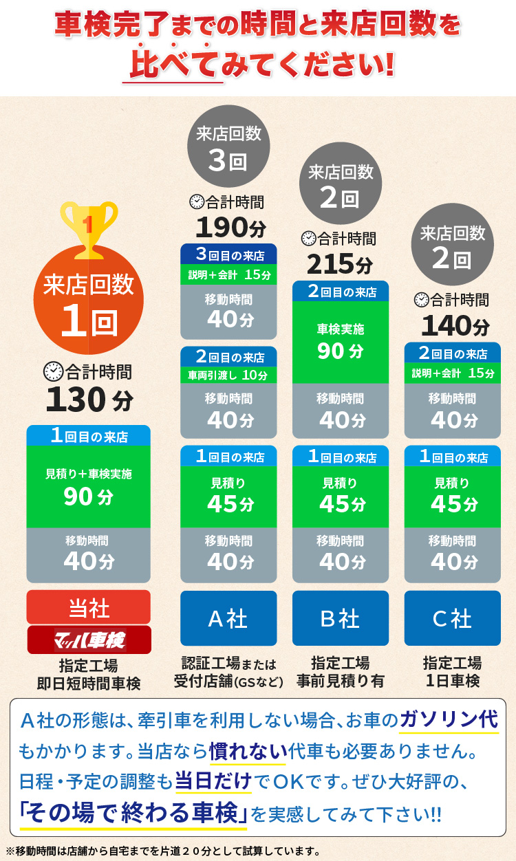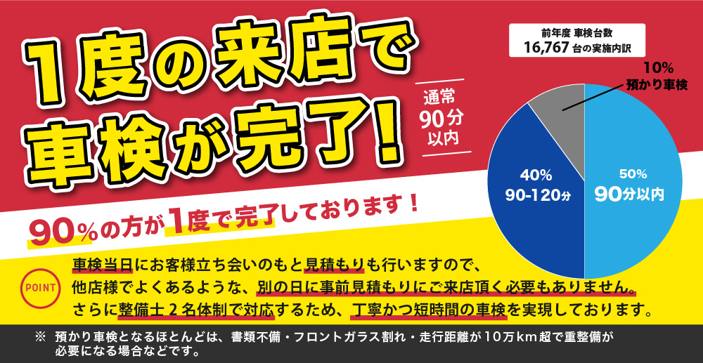 当店では通常90分で車検が完了します。お買い物ついでに、お仕事の帰りに是非弊社車検工場へお立ち寄りくださいませ。